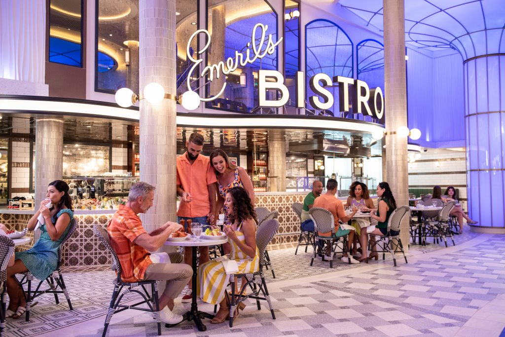 Festival Grounds and Coffee Bar, Pizza Palooza, Rhythm & Rolls Deli, Guy’s Burger Joint, Big Chicken, Street Eats, Bluelguana Cantina, Lido Marketplace, Cucina del Capitano, Fresh Creations, Chibang. Sit Down: Palm Dining Room, Bonsai Teppyanki (Additional fee) Guy’s Pig & Anchor Smokehouse (Additional fee) Bonsai Sushi (Additional fee) Fahrenheit 555 Steakhouse (Additional fee) Seafood Shack (Additional fee) Emeril’s Bistro 1396 (Additional fee), Rudi’s Seagrill ( Additional fee) Room Service (Additional fee)